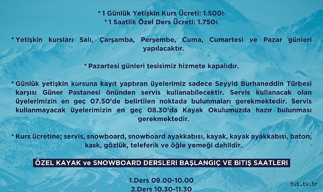 SPOR A.Ş.’DE KAYAK OKULU KAYITLARI BAŞLADIKayseri Büyükşehir Belediyesi Spor A.Ş. 2025 sezonunda Erciyes Kayak Merkezi’nde yetişkinler için kayak ve snowboard alanında düzenleyeceği Kayak Okulu Kurs Kayıtları’nı başlattı.2024 Avrupa Spor Şehirleri arasında "Yılın En İyi Spor Şehri" seçilen Kayseri’de Büyükşehir Belediyesi, kış turizminin yanı sıra bu yıl da kayak ve snowboard kurslarıyla misafirlerini ağırlamaya hazırlanıyor.Kayseri Büyükşehir Belediyesi Spor A.Ş., 2025 kış sezonu için Kayak Okulu’nda düzenleyeceği kayak ve snowboard kurslarının kayıtlarını açtı. 16-65 yaş aralığındaki katılımcılar için hazırlanan bu kurslar, kış sporlarını öğrenmek veya geliştirmek isteyen sporseverlere eşsiz bir fırsat sunuyor.Eğitimler, salıdan pazar gününe kadar profesyonel eğitmenler eşliğinde gerçekleştirilirken, pazartesi günleri tesis kapalı olacak. Kurslar, grup eğitimleri ve birebir özel ders seçenekleriyle her seviyeden katılımcıya hitap ediyor. Öte yandan tesis, sömestir tatiline denk gelen pazartesi günü açık olacak.Kurs ücretleri içerisinde kayak, snowboard, bot, kask, gözlük, baton gibi kayak ve snowboard ekipmanları ile teleferik hizmeti ve öğle yemeği de yer alıyor.Ayrıca özel dersler sabah 09.00’dan başlayarak gün boyu dört farklı zaman diliminde düzenleniyor.Servis kullanmak isteyen katılımcılar için Seyyid Burhaneddin Türbesi karşısındaki Güner Pastanesi önünden sabah 07.50’de hareket eden servis hizmeti sunuluyor. Servis kullanmayacak katılımcıların ise en geç 08.30’da kayak tesislerinde hazır bulunması gerekiyor.Nasıl Kayıt Olunur?Kurs kayıtları yalnızca çevrimiçi olarak yapılabiliyor. Daha fazla bilgi almak isteyenler www.sporaskayseri.com.tr resmi web sitesini ziyaret ederek veya 0532 479 10 38 numaralı iletişim hattından detaylı bilgi alabilecek.